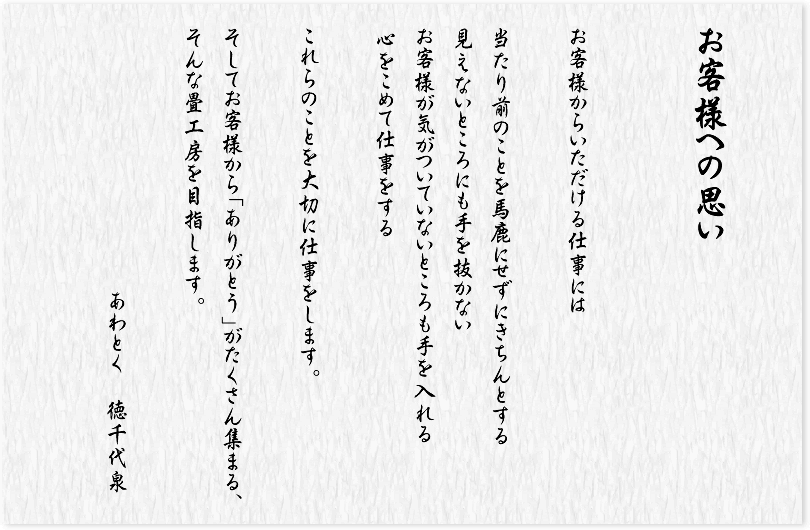 畳だけを納品するのではなく、畳のある快適な生活を納品させていただく気持ちを常に持ち続けます。