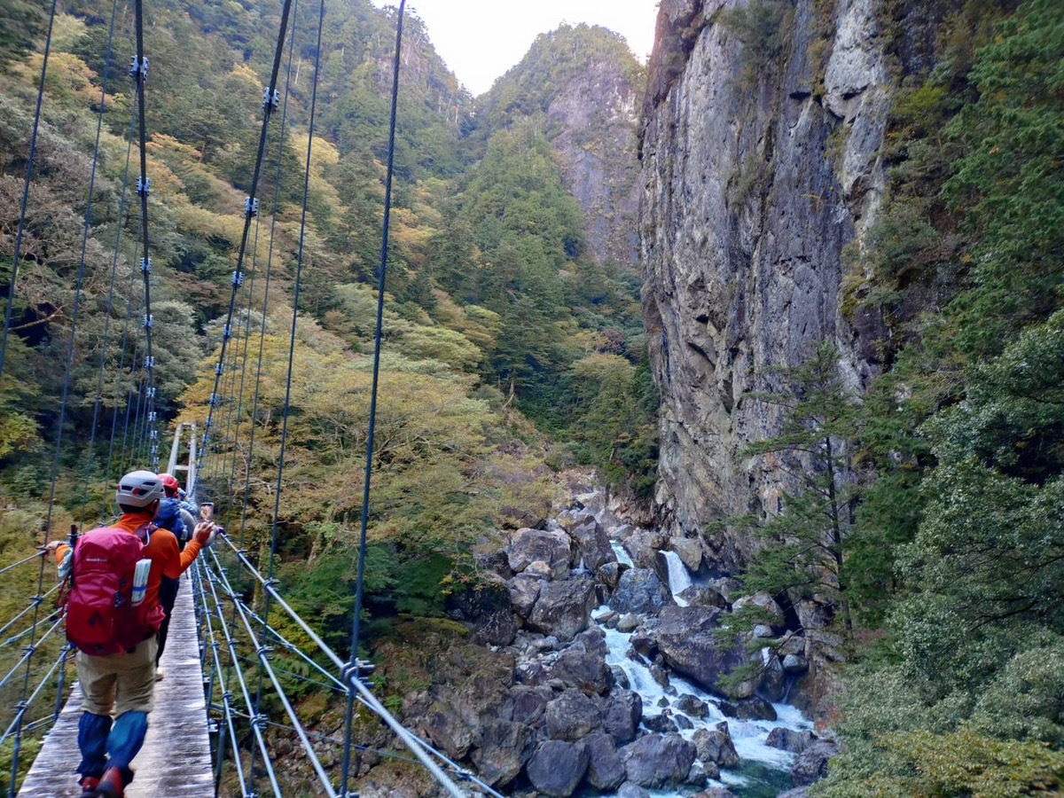 大杉峡谷の登山口から入山し、峡谷沿いのコースを約5時間歩いて、この日の宿となる桃の木山の家を目指します。