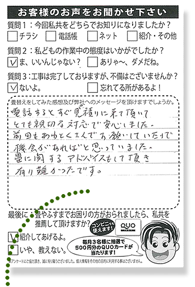 電話するとすぐ見積もりに来て頂いて、とても親切な対応で安心しました。前回もあわとくさんでお願いしていたので、機会があればと思っていました。畳に関するアドバイスもして頂き、有り難かったです。 \ 最新情報をチェック /