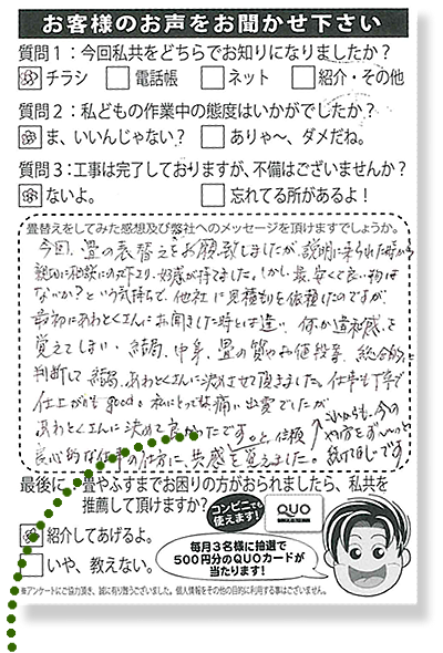今回、畳の表替えをお願い致しましたが、説明に来られた時から親切に相談にのって下さり、好感が持てました。