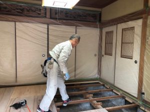 電動ノコギリを使うと切りくずなどが飛び散るので、壁にビニールをかけ保護し、いよいよ床板をめくっていきます。