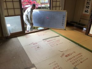 木の板を全て張り終わり、保護していたビニールを外したら、あとは裏返した畳を納めるだけですね。