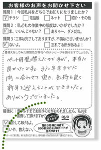ペット用畳に替えたのですが、本当に良かったです。また年末までに間に合わせて頂き、気持ち良く新年を迎えることができました。ありがとうございました。