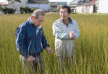 イグサの栽培には通常、「除草剤」「殺虫剤」の2種類の農薬を使いますが、酒井さんが永年努力して作った良く肥えた土壌と害虫を防ぐための水管理で、通常の農薬使用量の半分から7割程度でイグサを栽培しています。