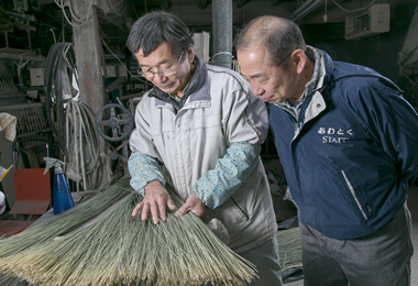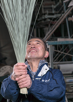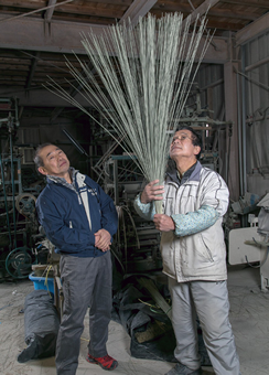 選別されたイグサを数十本手にとって、酒井さん自らが、絶妙な力加減、バランスといったプロの職人技で振ります。